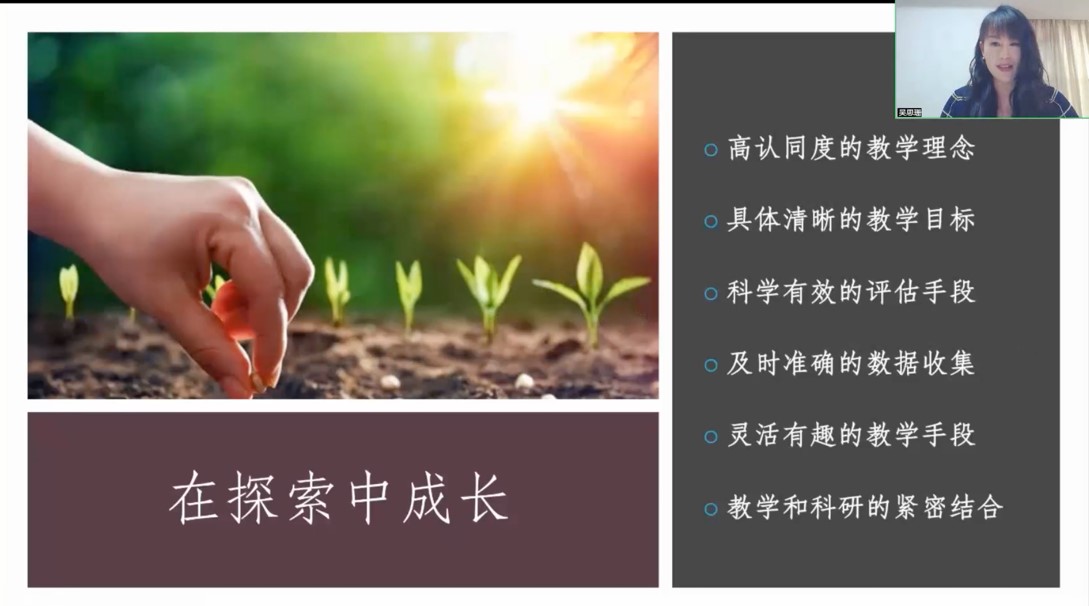 紧接着,吴思珊老师分享了她在视听续说教学与科研探索中成长的过程,总结出以下心得体会:高认同度的教学理念、具体清晰的教学目标、科学有效的评估手段、及时准确的数据收集、灵活有趣的教学手段。她特别强调了教学与科研的紧密结合不仅有利于教师自身发展,还可以为学生提供更具深度和广度的学习体验。