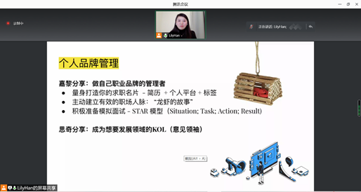 2022年1月11日上午,现世界五百强企业谷歌资深战略采购经理、2008级商英学院国际商务管理专业校友韩嘉黎女士,硅谷独角兽公司Automation Anywhere增长营销高级经理、2011级国际新闻专业校友林思奇女士受邀作题为“就业力”的线上讲座,吸引了众多同学的在线参与和学习。