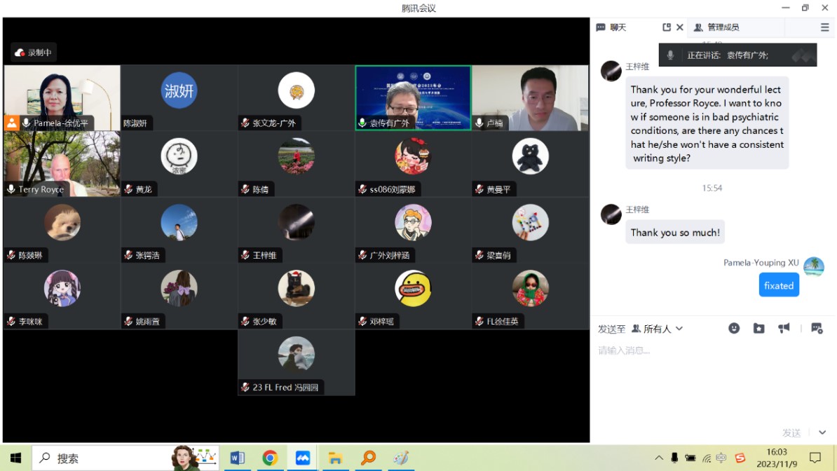 2023119日,商英学院云山讲座教授Terry Royce的法律语言学系列讲座第四讲于下午2点半如期在线上举行。本次讲座由商英学院徐优平副教授主持。文科基地袁传有教授,商英学院研究生办公室主任卢楠博士,法律英语系张少敏老师以及法律语言学专业的硕博士生参加了此次讲座。