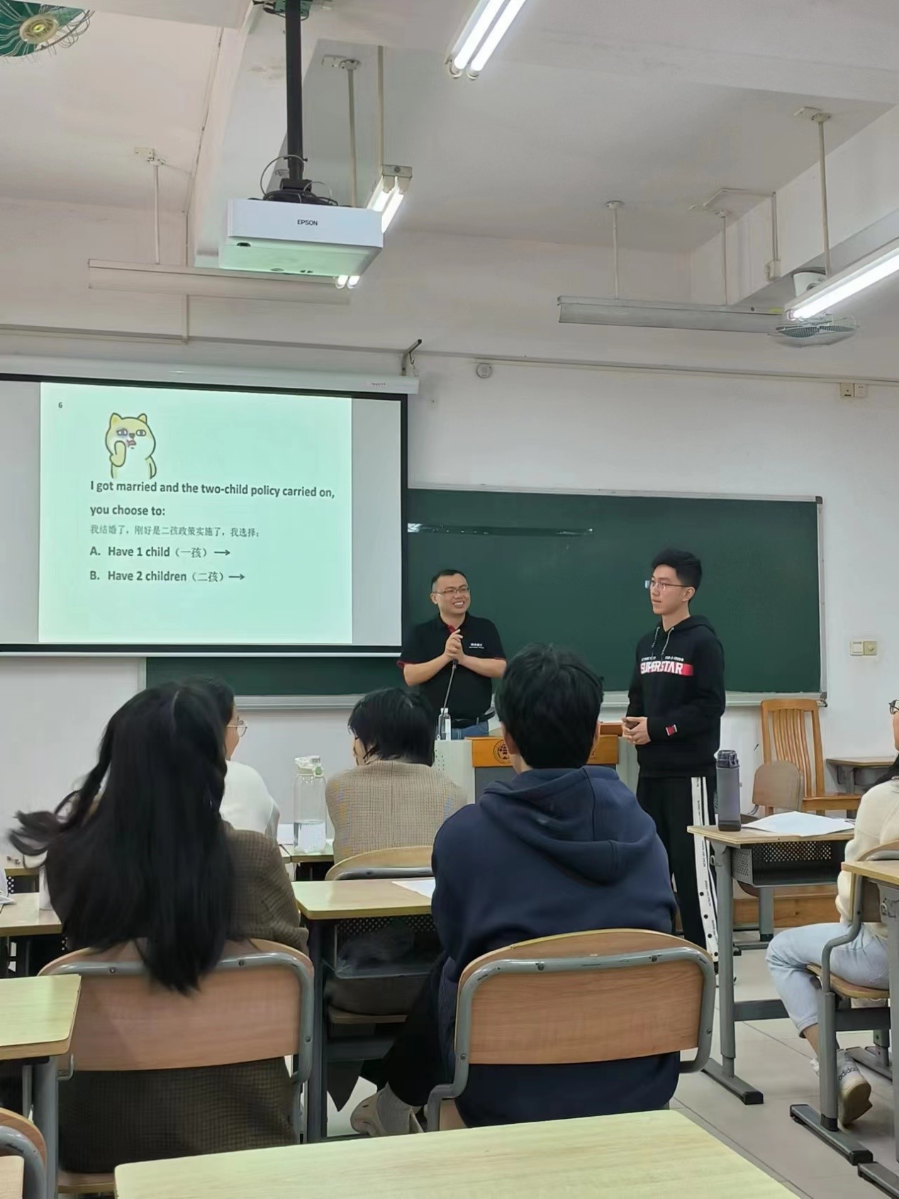 在最后的实战环节,谢老师也没有选择干巴巴的传统即兴演讲主题,而是让几位同学参与了一个“人生选择游戏”——假如人生重来,在不同的节点你会如何选择?同学们就不同的选择进行了精彩的即兴演讲,现场氛围达到最顶点。随后,经过讨论投票,大家选出了本次实践的最佳演讲者并颁发奖状,让有趣的灵魂得到应有的褒扬。