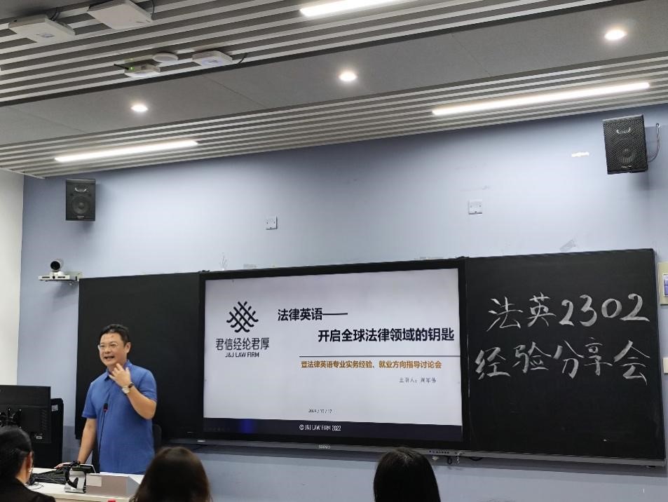 在校外导师分享环节,周军伟律师对律师事务所实习实务、法律英语未来的就业前景、涉外律师应具备的基本素质等内容进行了详细分享,鼓励同学们在校期间勤实践、多思考,并强调要注重锻炼自身逻辑思维能力,以应对未来工作中的各种挑战。