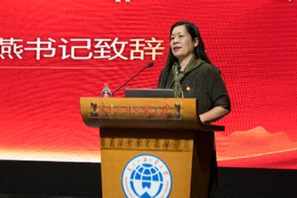 在授旗仪式上,苏冬燕书记授予党员代表黄家斌同志党旗,并寄语党员同志,希望能以党旗引路,将党的优良传统带到广交会实习工作现场中去。