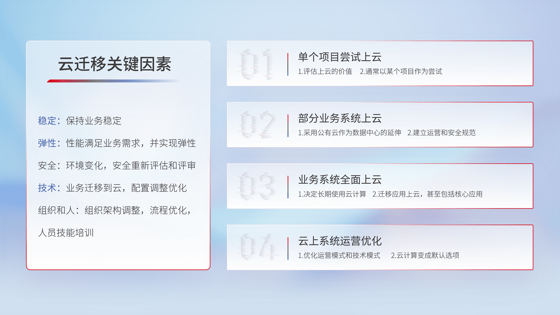 结合实际业务,,从规划设计、、、云平台选型、、、、云原生改造、、、、数据迁移、、集成交付,,迁移全过程为客户识别最佳上云路径,,做好风险识别管理,,,设计网络架构、、、身份权限、、、安全审计合规、、、操作审计、、日志审计、、、监控告警策略、、、多站点容灾设计等,,,,对云上基础设施进行整体规划,,,提升IT治理水平,,,以满足弹性、、、、高可用、、高性能的需求。。。。
