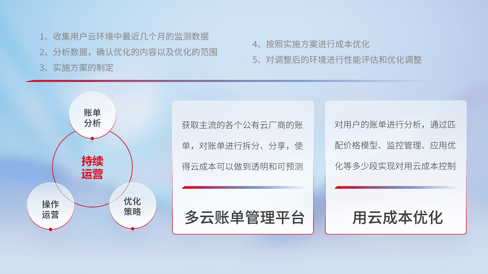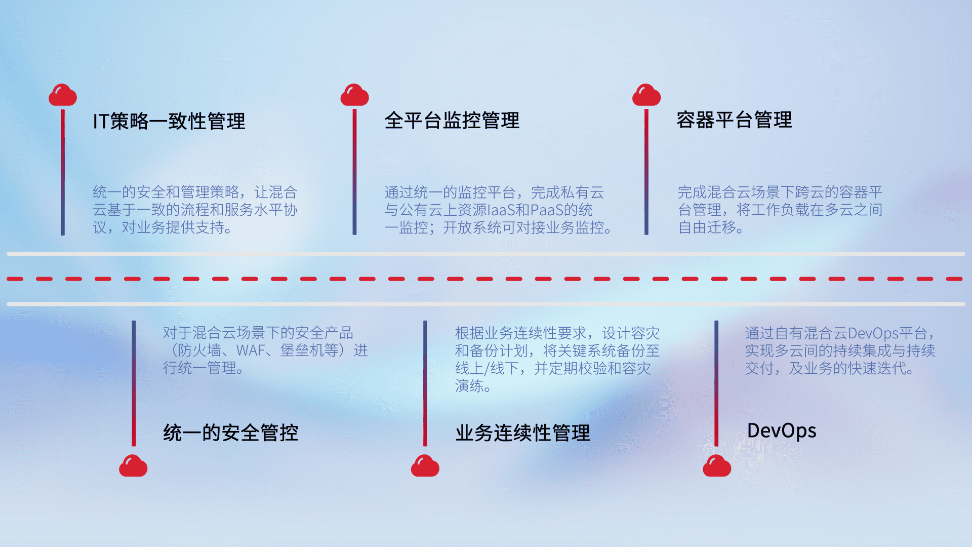 通过多云纳管,,,以统一的资源数据模型把客户的云资源进行抽象和封装,,,,进而实现对多云资源的统一操作,,,保障云资源管理的可靠性、、、、稳定性与可用性。。。。量身定制化运维内容,,,,配置、、、、开发运维、、补丁管理、、、、备份、、、、监控、、、、认证和访问管理、、、审计和日常巡检等,,,,保障在用云过程中的可靠度,,,,稳定度以及高可用率。。。。