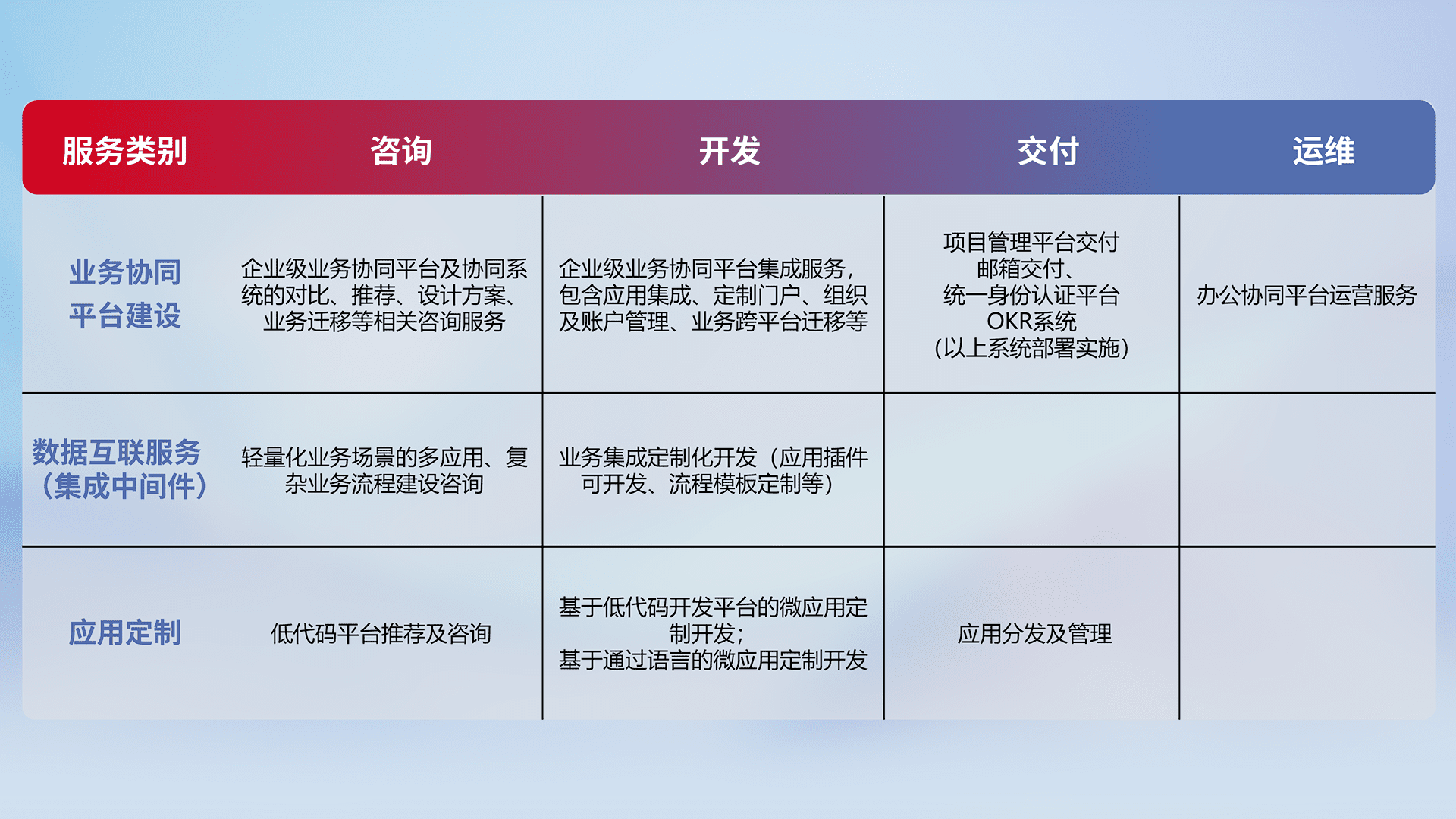 针对钉钉、、、企微、、IDaas等平台级产品提供产品的规划、、方案、、、、交付、、、、定制化开发等服务,,,实现如统一协同办公、、、、智能客户服务、、、、混合会议管理、、、智能数据查询、、、、等业务场景,,,实现数字化转型。。。。